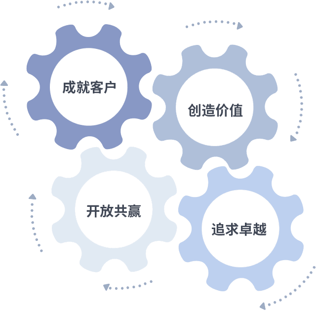 成就客户是一切决策的出发点,,,创造价值是衡量所有工作的标准,,,,追求卓越是我们做事做人的态度,,开放共赢是我们的格局也是最终的结果。。。。价值观的齿轮环环相扣,,,,推动着组织里的每个人不断向前。。