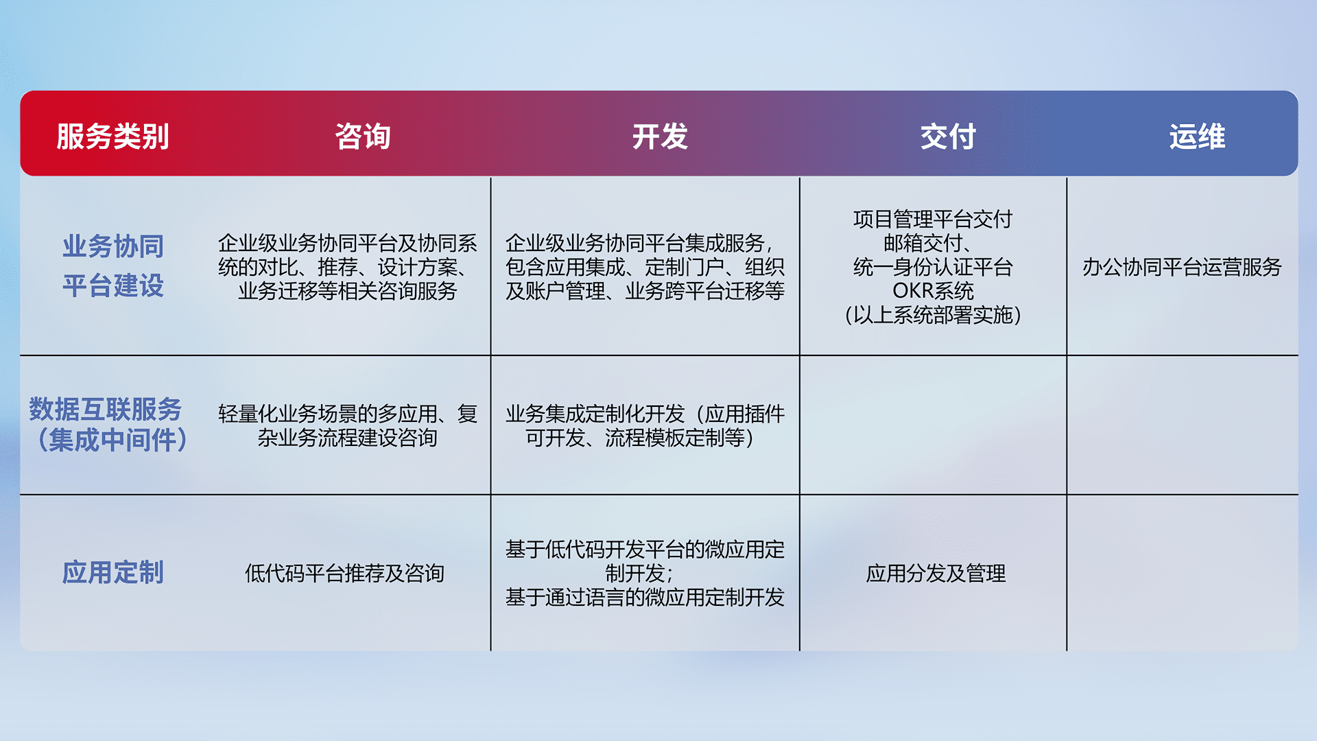 针对钉钉、、企微、、、、IDaas等平台级产品提供产品的规划、、、方案、、交付、、、、定制化开发等服务,,,实现如统一协同办公、、、智能客户服务、、混合会议管理、、智能数据查询、、、、等业务场景,,实现数字化转型。。
