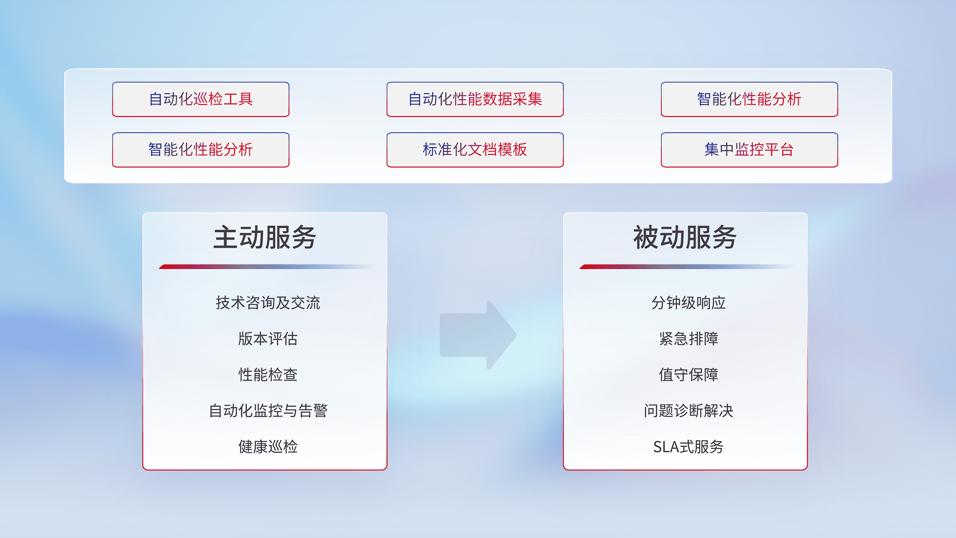 智能化工具和标准化文档,,保障服务质量,,,提供主动服务(包含技术咨询、、、、版本评估、、、性能检查、、自动化监控与告警、、健康巡检)和被动服务包含(分钟级响应、、、、紧急排障、、、、值守保障、、、问题诊断解决、、SLA服务)。。。。